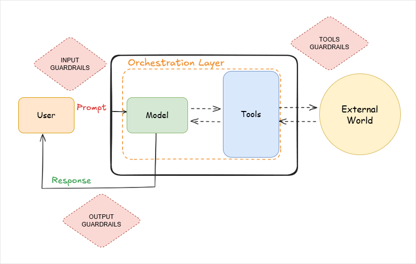 - Tool guardrails during tool useOutput guardrails before user delivery.