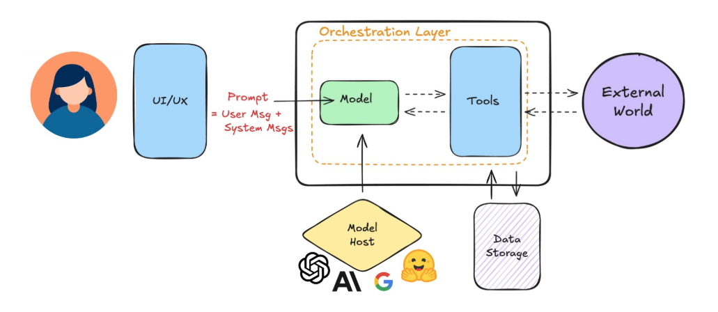 AI agents are one part of a larger system. They usually interact with users through chat boxes, dropdowns, or other input elements, while the model runs separately, often on a server.