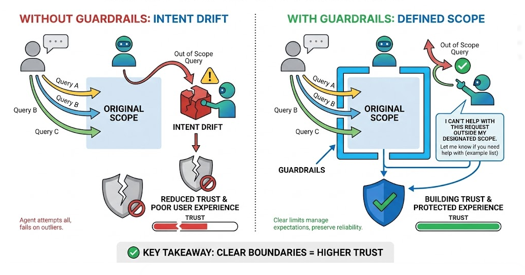 To counter intent drifts, define clear boundaries. If a request is out of scope, the agent should say so clearly and politely. Honest limits build more trust than incorrect answers. Guardrails protect both the system and the user experience.