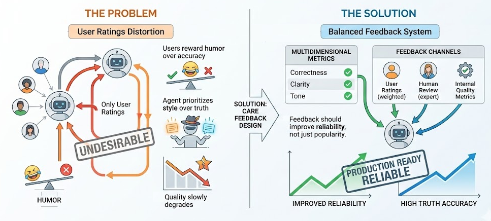As a solution, you need to design feedback systems carefully. Combine user ratings with human review and clear metrics like correctness, clarity, and tone. Feedback should improve reliability, not just popularity.