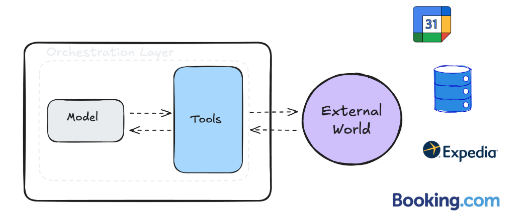 In a travel example, tools might include a calendar API, a company policy document, or a booking website API. The model decides which tool to use, and the tool performs the action.