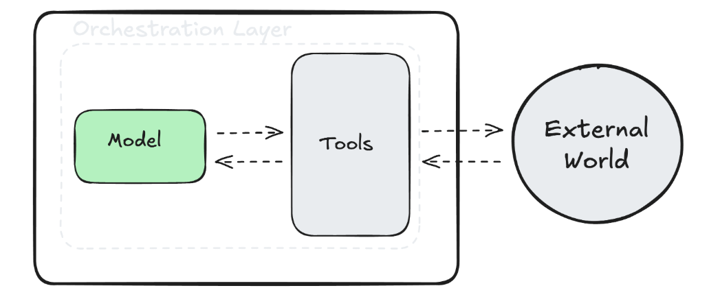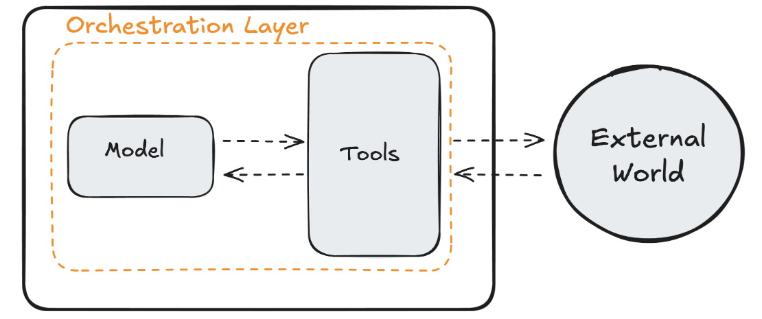 The orchestration layer manages how the agent thinks and acts over time. It keeps the process running until the goal is achieved or a stopping condition is met.