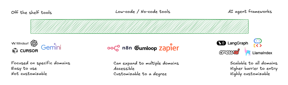 After deciding to use an agent, the next step is choosing the right tooling. The ecosystem ranges from ready-made tools to fully custom frameworks.