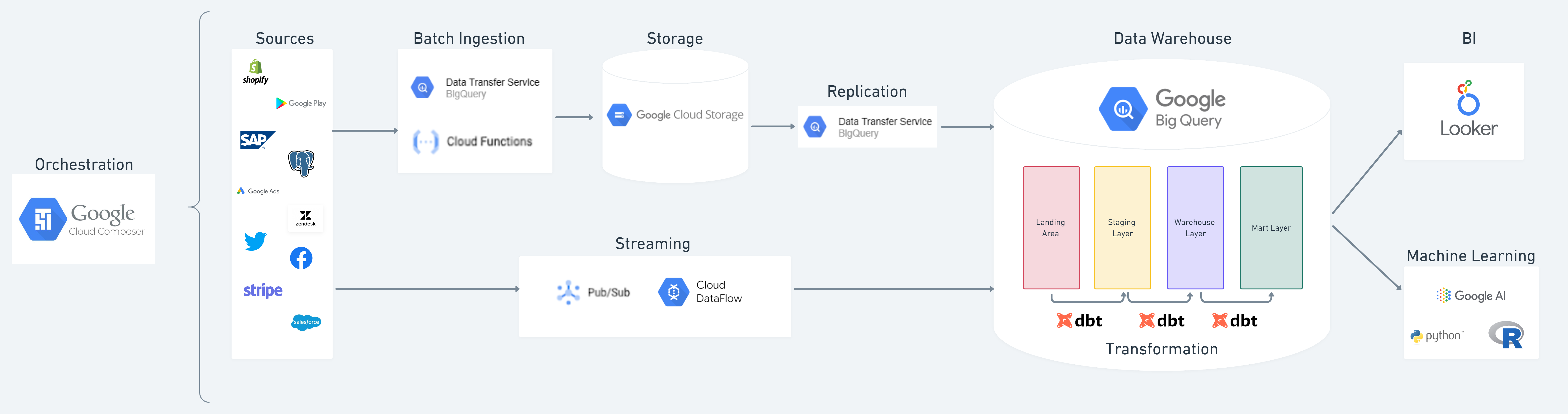 Unlike traditional data warehouses, a GCP data lake uses a modular architecture of integrated, serverless services to manage data at any scale and enable real-time and batch analytics.