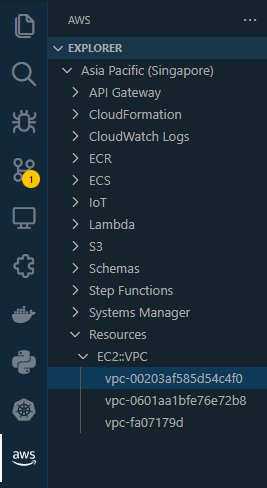 On the Explorer tab on the left in VSCode, you should still see the available resources for Asia Pacific region when you click the AWS icon on the left panel. Scroll at the bottom and then click,