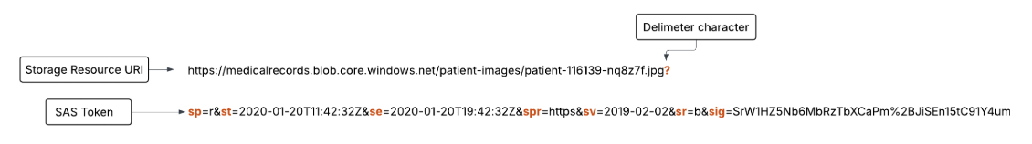 A SAS starts with a URI to the storage resource and appends a SAS token. The token contains key-value pairs defining permissions, time limits, and resource type.