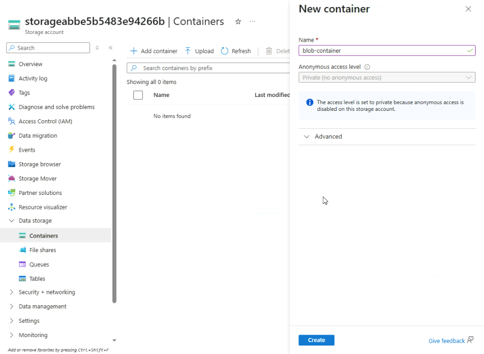 Click Add container and provide a name. Click Create.