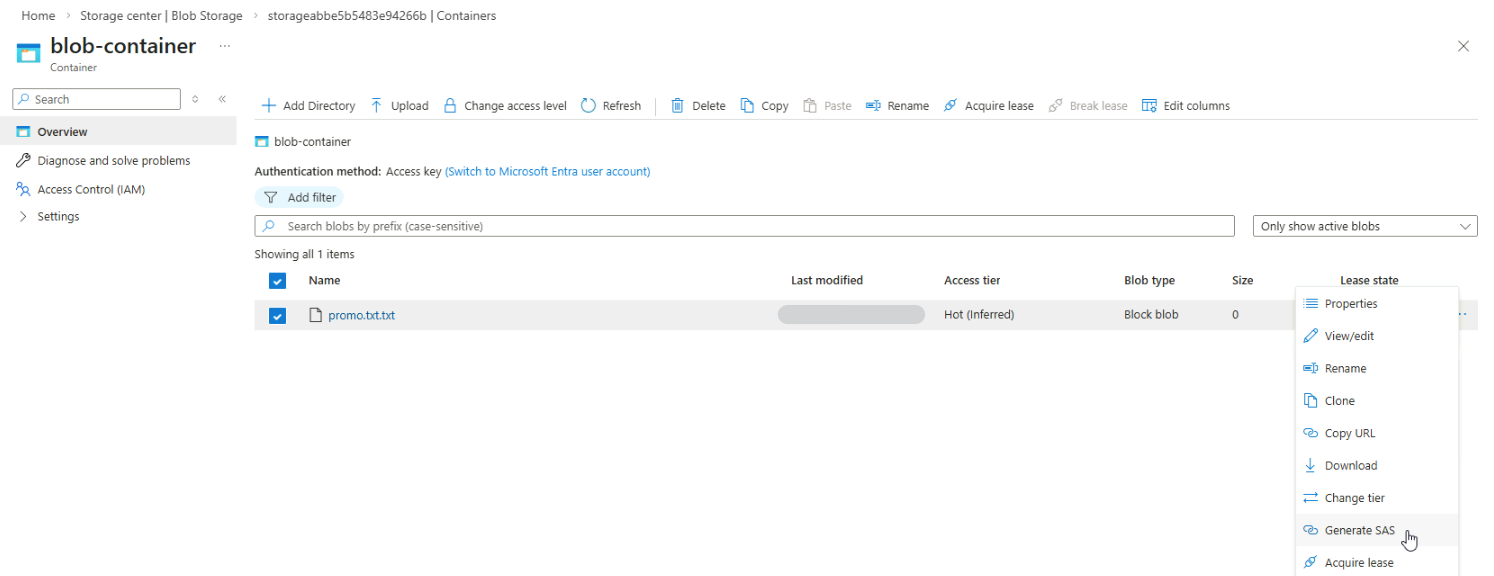 To share this file securely, you can use SAS tokens. Click the three dots on the right hand side and select Generate SAS.