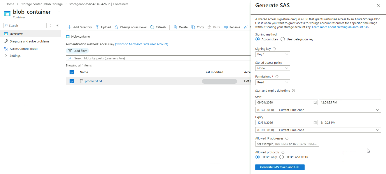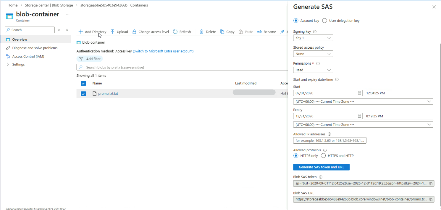 You can modify settings such as the signing method, stored access policy, and expiration time. Once configured, click Generate SAS token and URL.