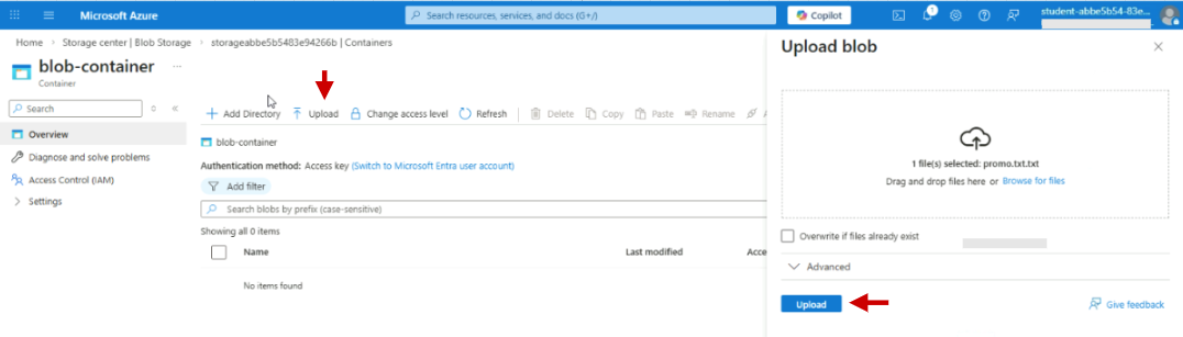 After its created, open the new container. You can upload file heres by clicking Upload.