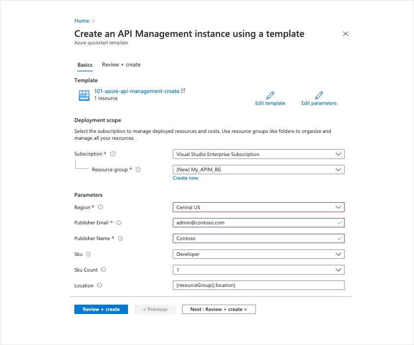 | Parameters | Values provided at deployment, like APIM name, location, or SKU |