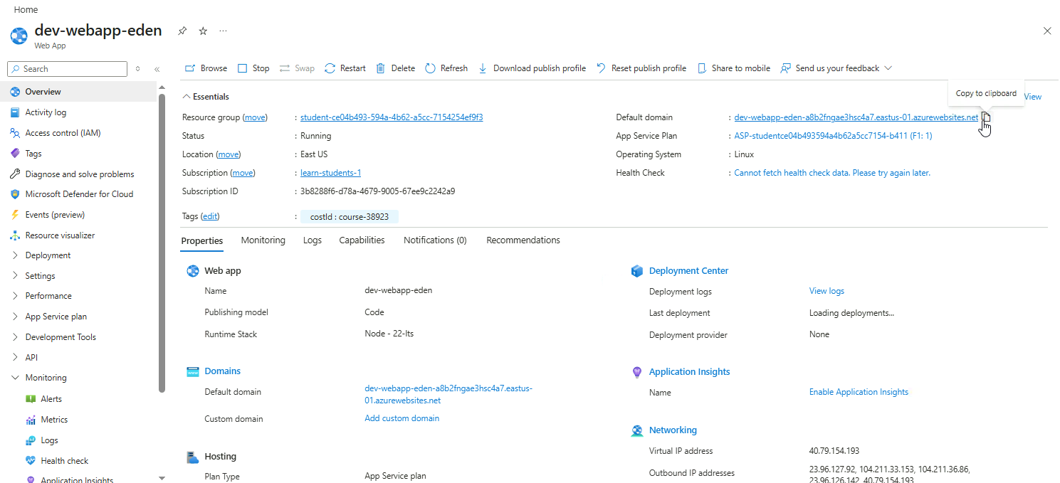 Open you web app and copy the defaul domain URL.