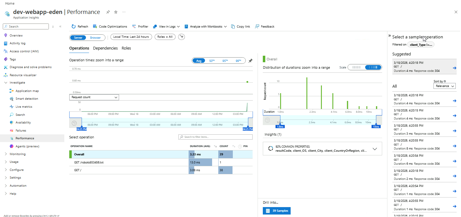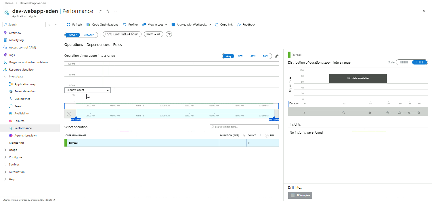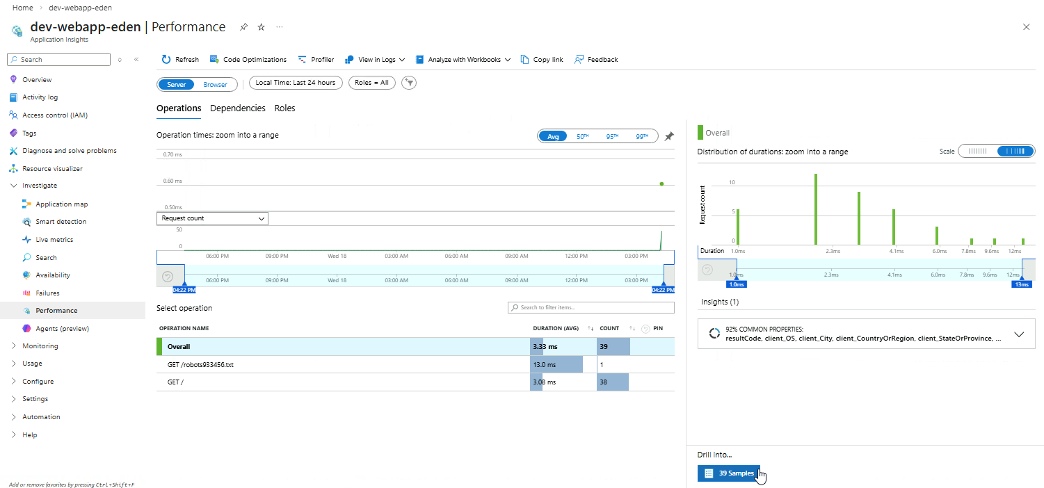 In the Application Insights resource, go to Investigate ➔ Performance.