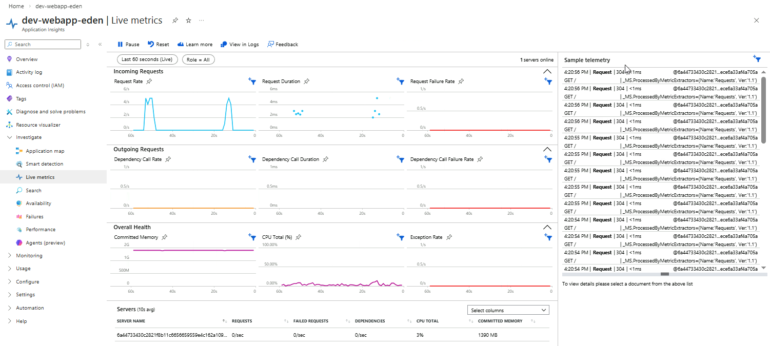 Go to Investigate ➔ Live Metrics and view the real-time telemetry.