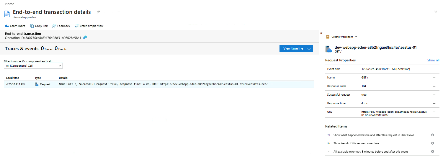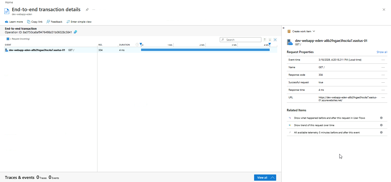 The traces, dependencies, and events captured for that operation provides you a full picture of how the request flowed through your app.