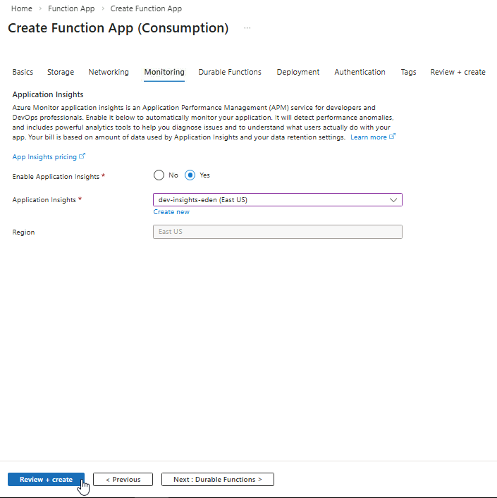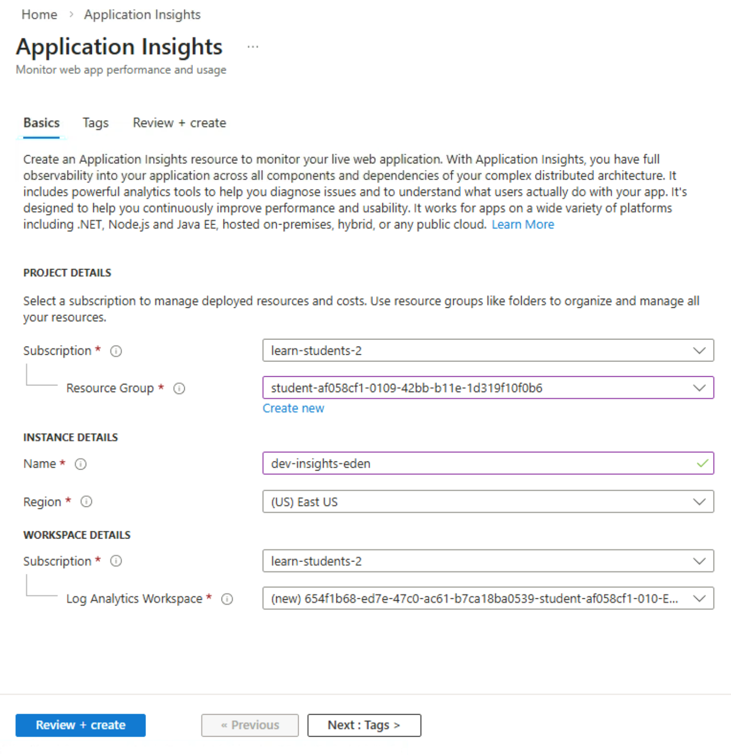 Fill in the necessary details for the Application Insights resource, such as the name, region, and resource group.