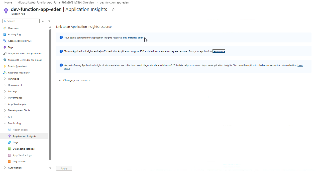Open the new function app and go to Monitoring ➔ Application Insights.