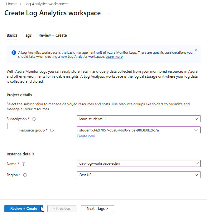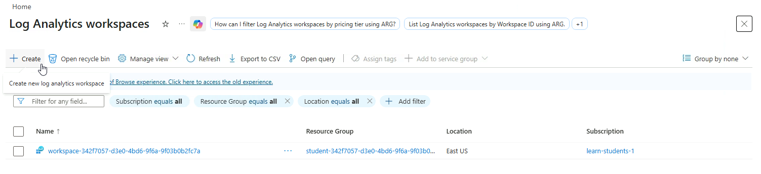 This creates the workspace where all logs will be stored and analyzed.