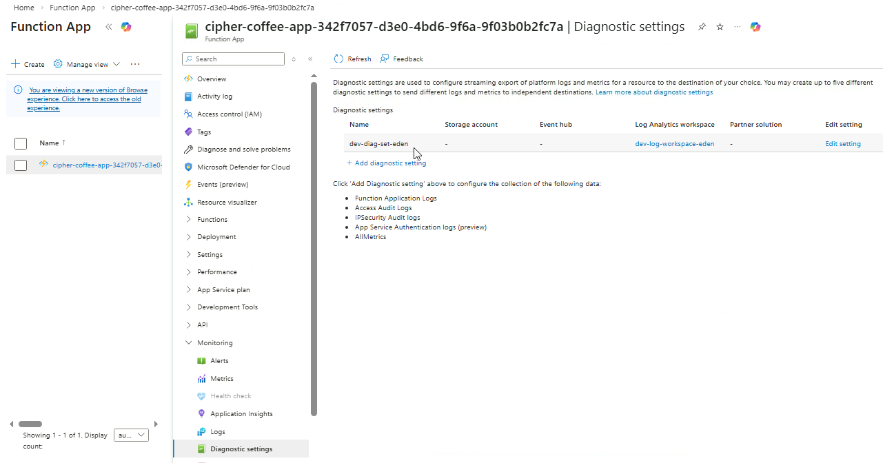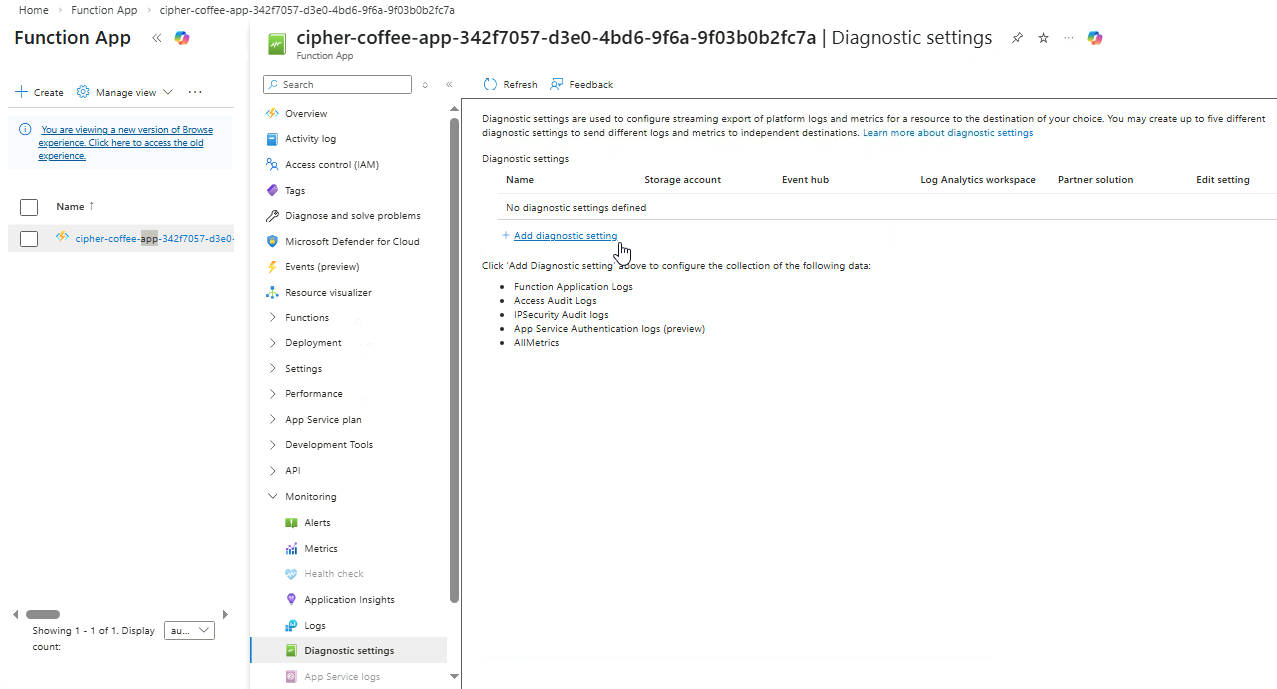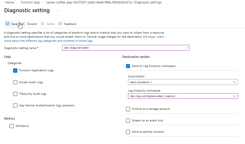 Note: It may take several minutes for FunctionAppLogs data to appear after configuring diagnostic settings.
