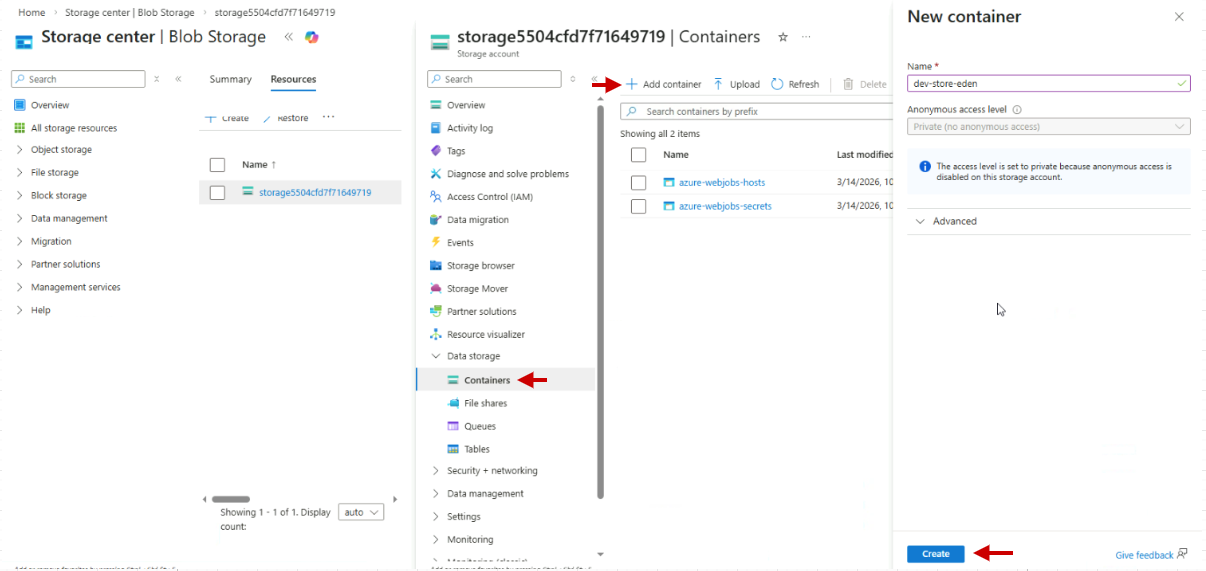 Navigate to your Storage account and create a new container.