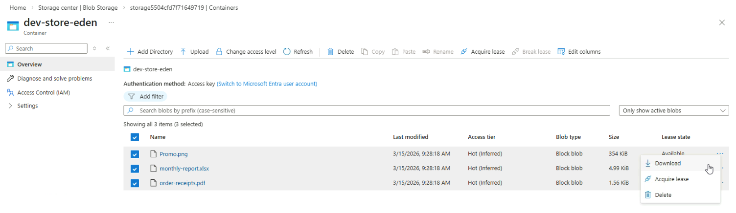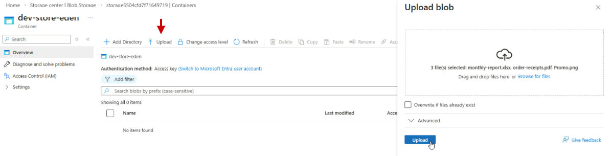 Open the container and upload at least three files.