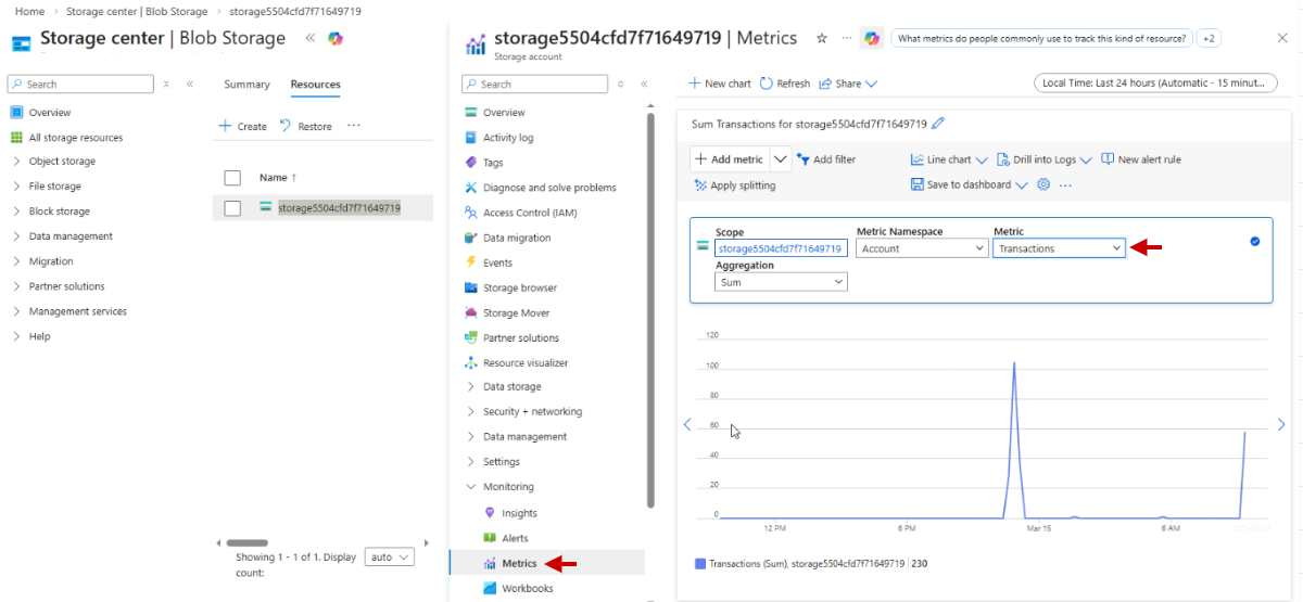 Select "Transactions" as the metric to view recent storage activity.