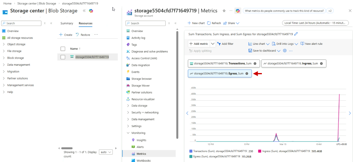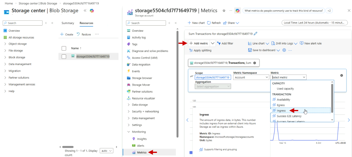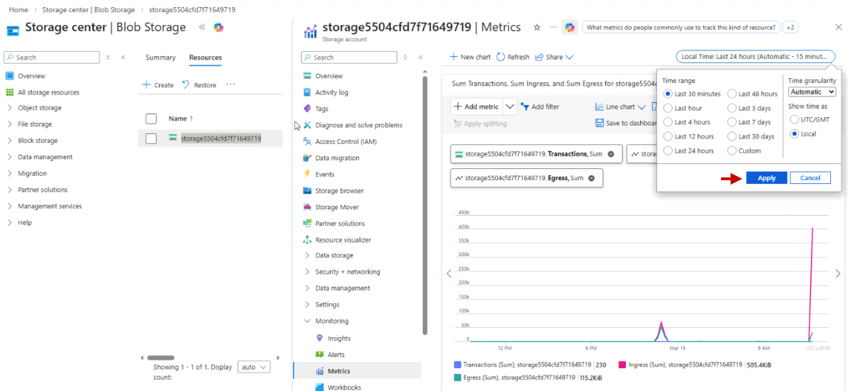 In your Storage account, go to Monitoring > Metrics.