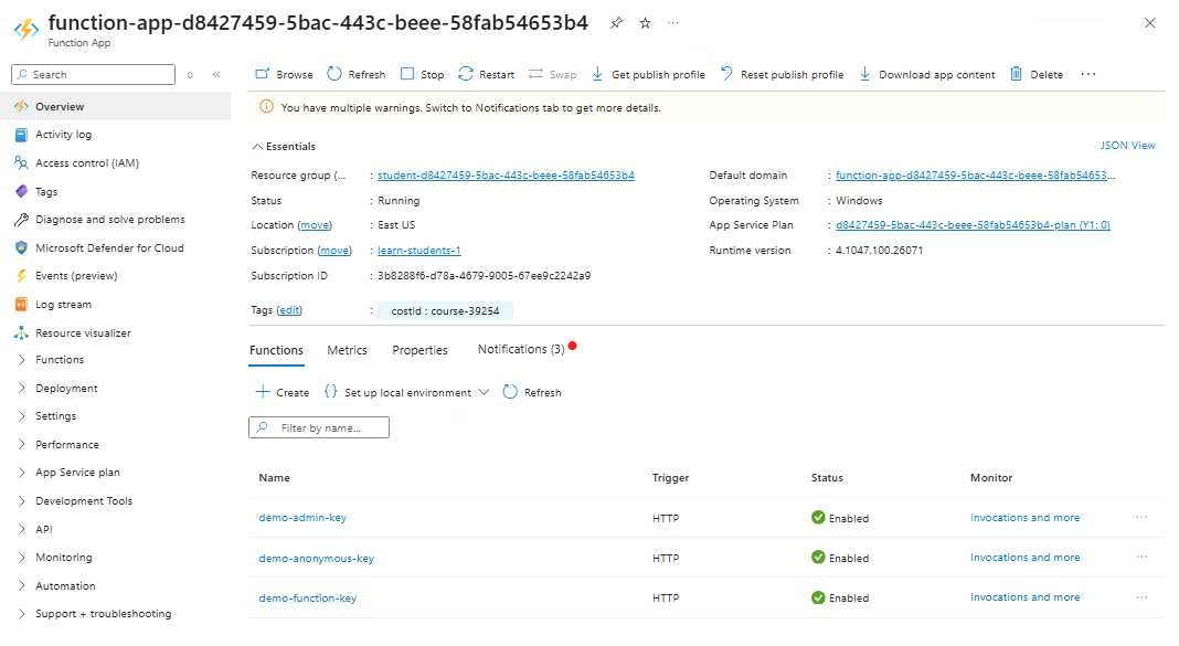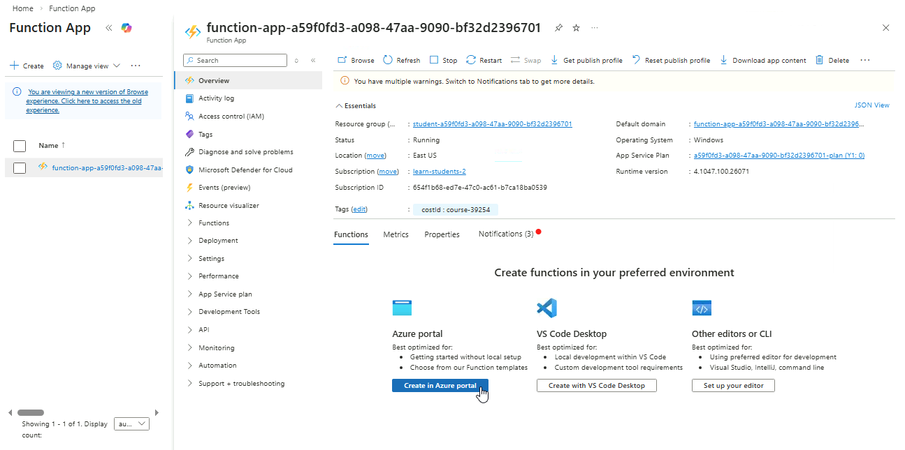 Note: If you're using the Consumption SKU for Function App, you may get an error: