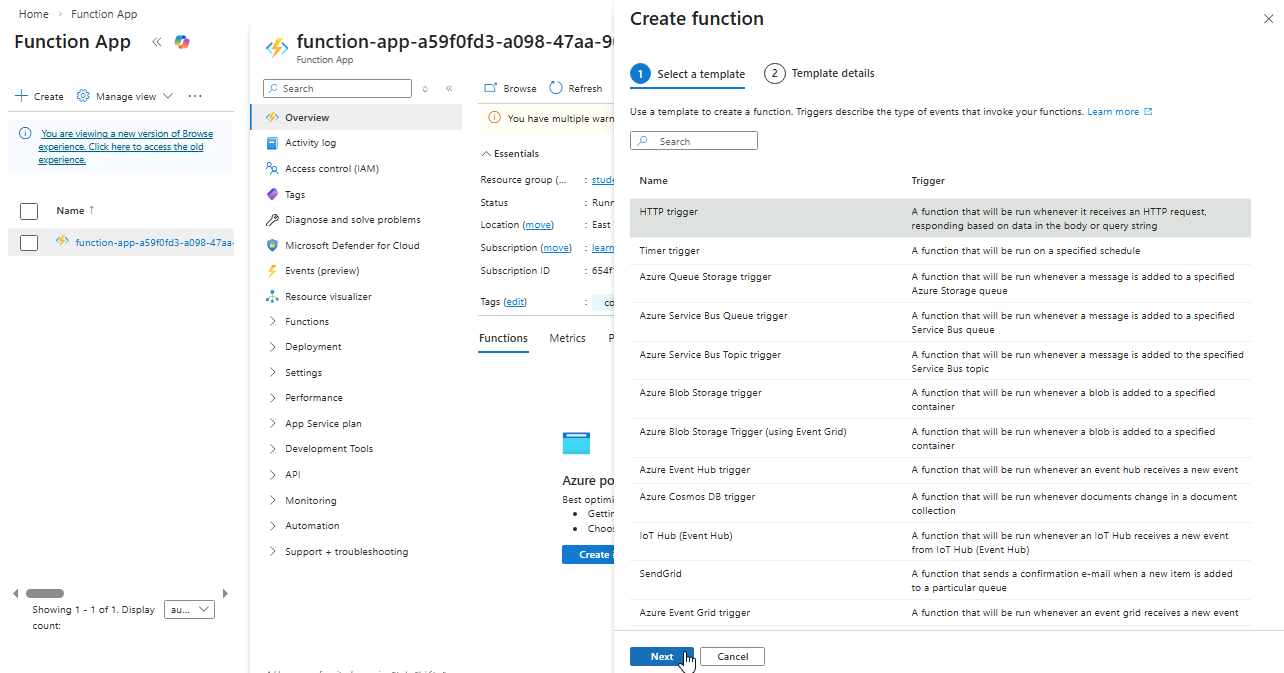 Open your Function App ➔ Overview ➔ Functions ➔ Create in Azure Portal.