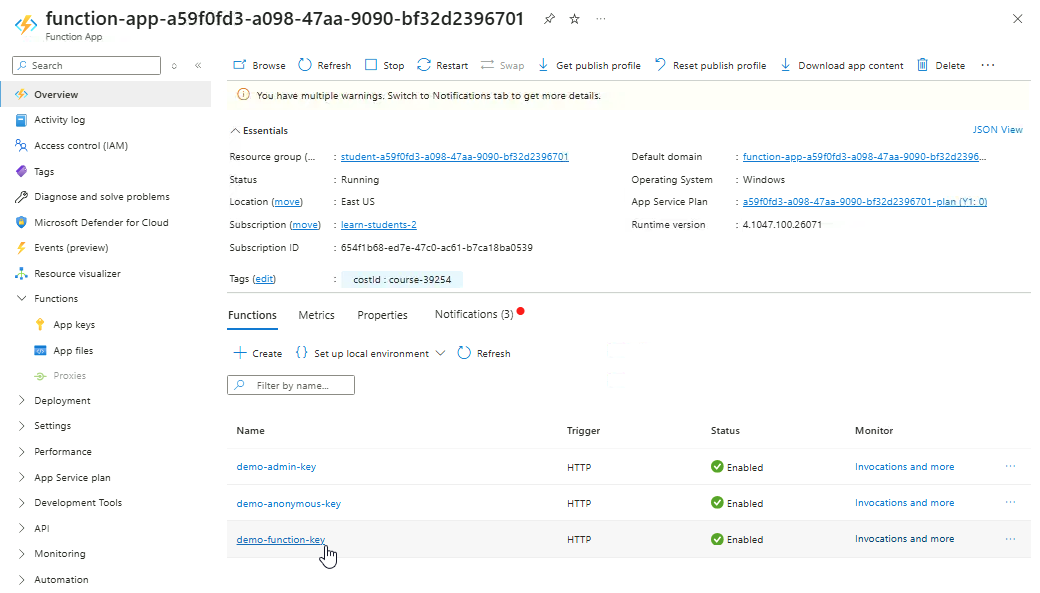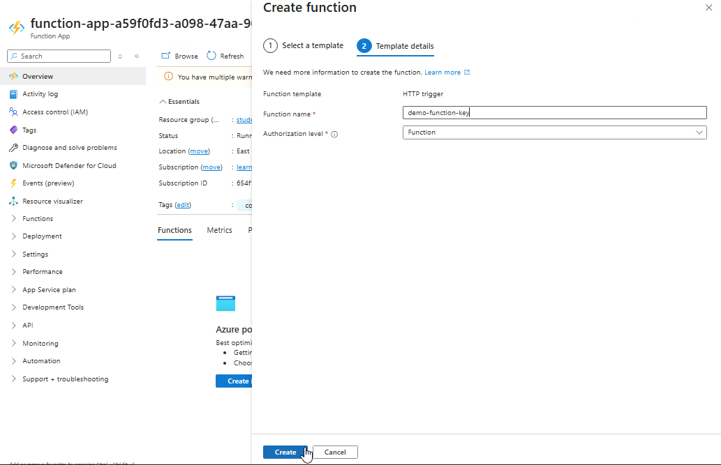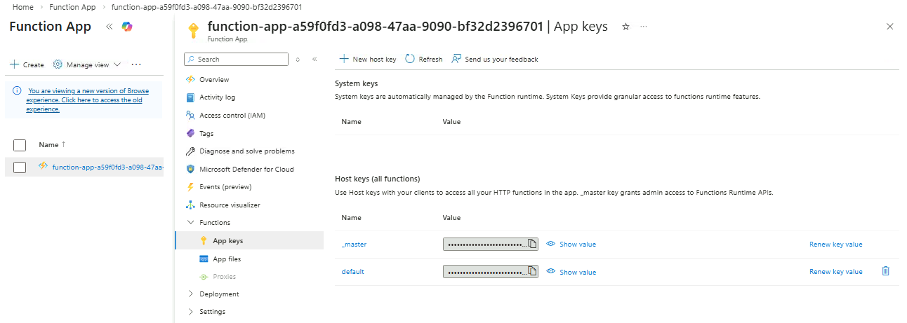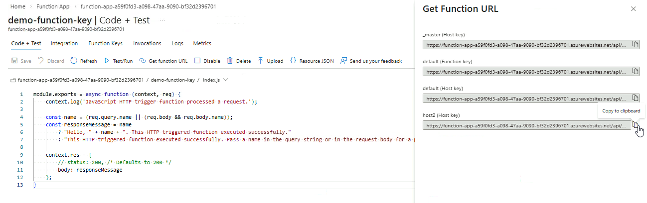 Open the function ➔ Get function URL ➔ Copy the URL labelled Function key.