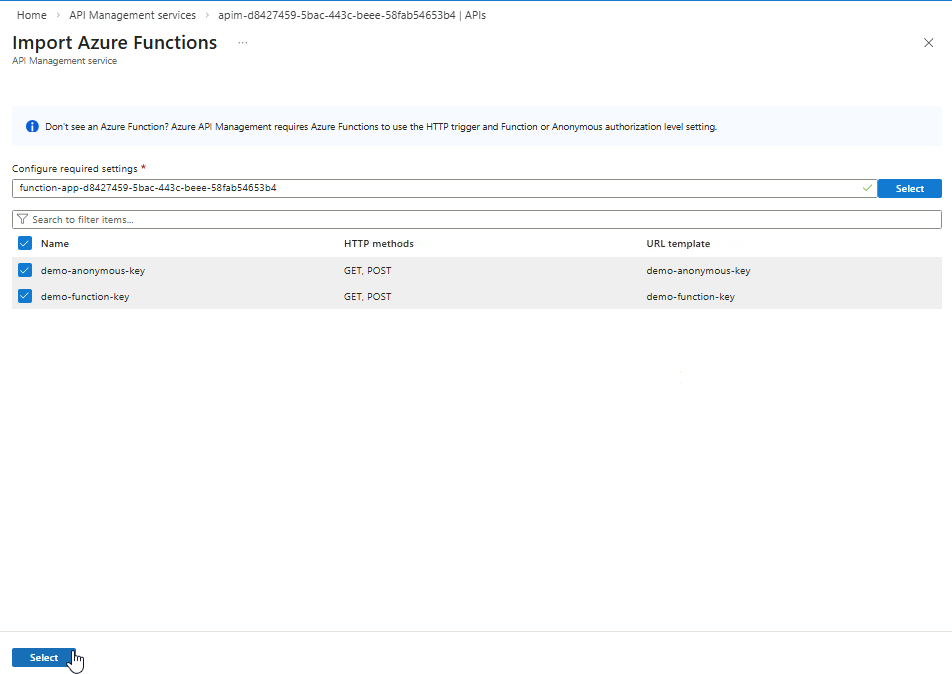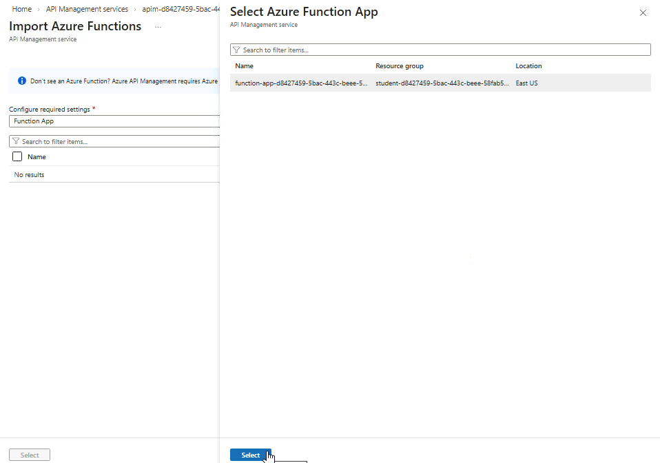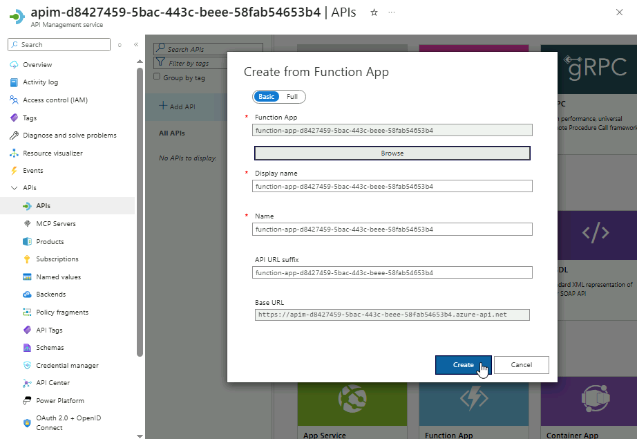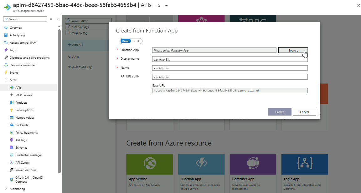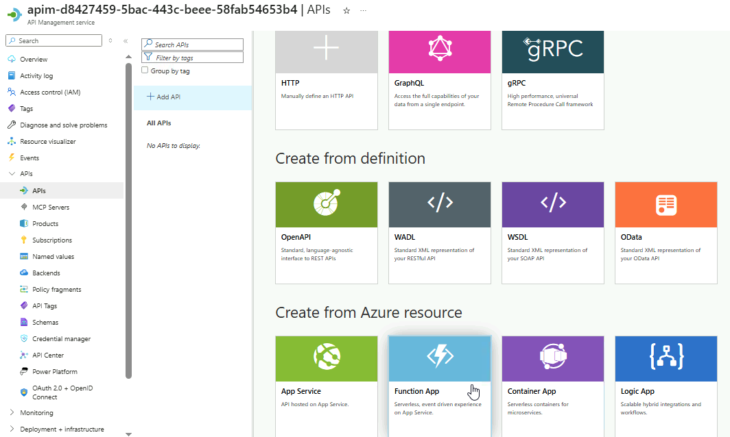 Go to APIs ➔ APIs ➔ Create from Azure resource ➔ Function App