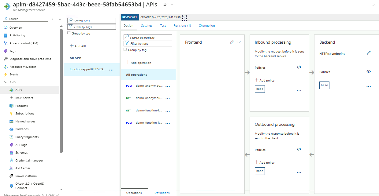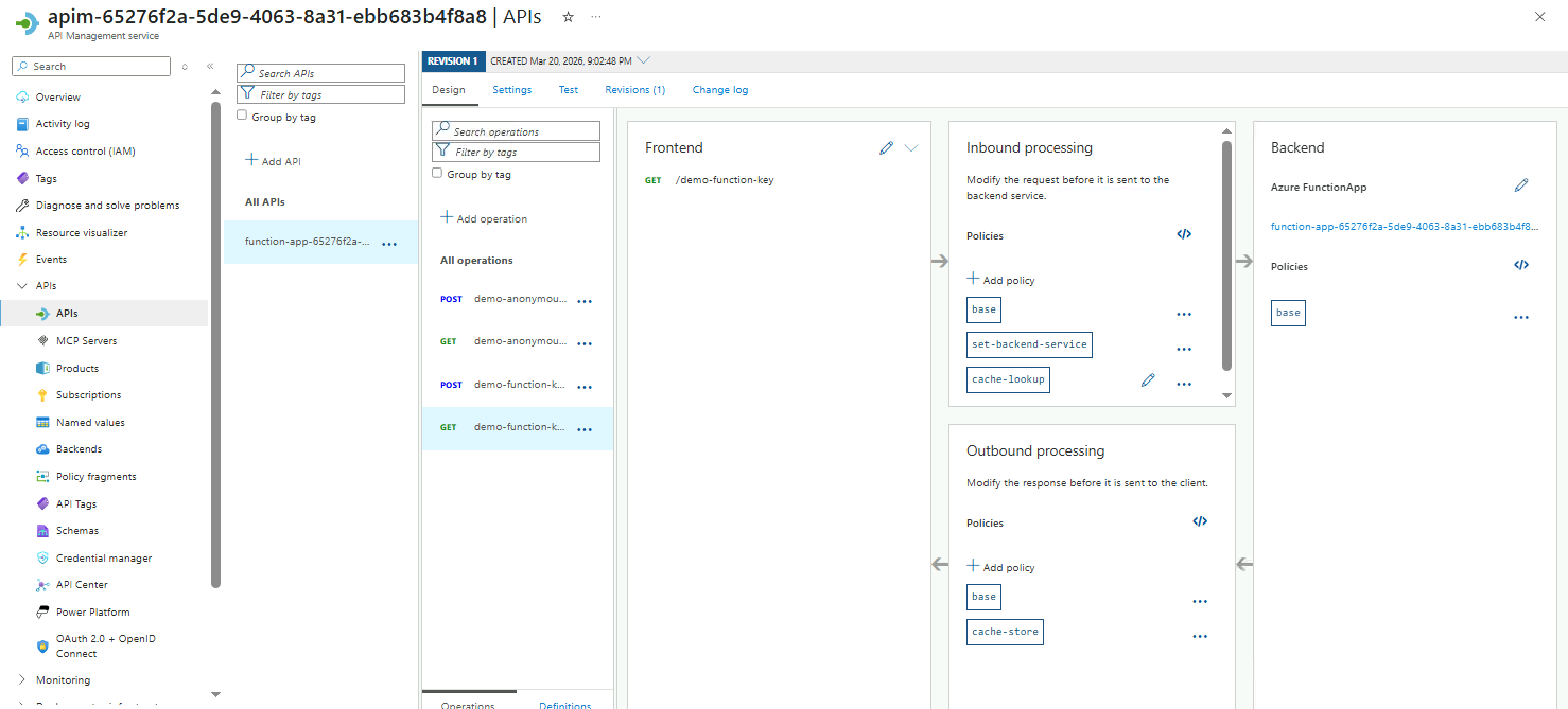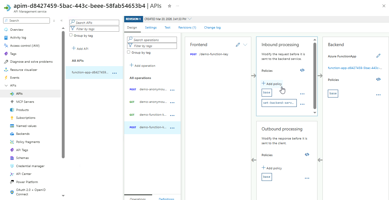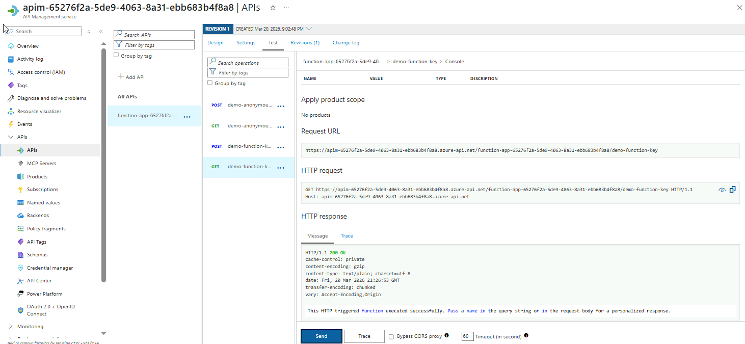 This lab demonstrates how to secure Azure Functions APIs, manage access with API keys, and apply APIM policies to improve reliability and performance.