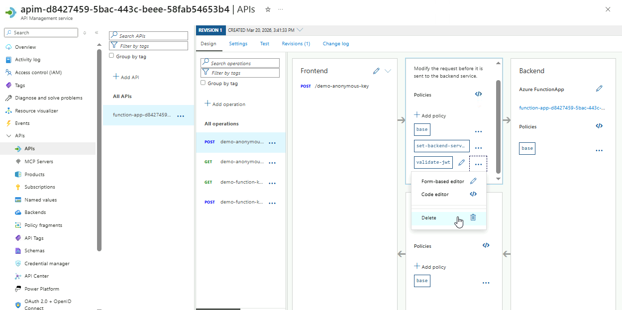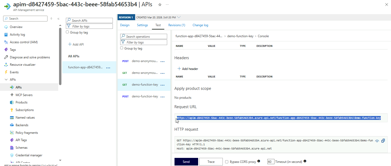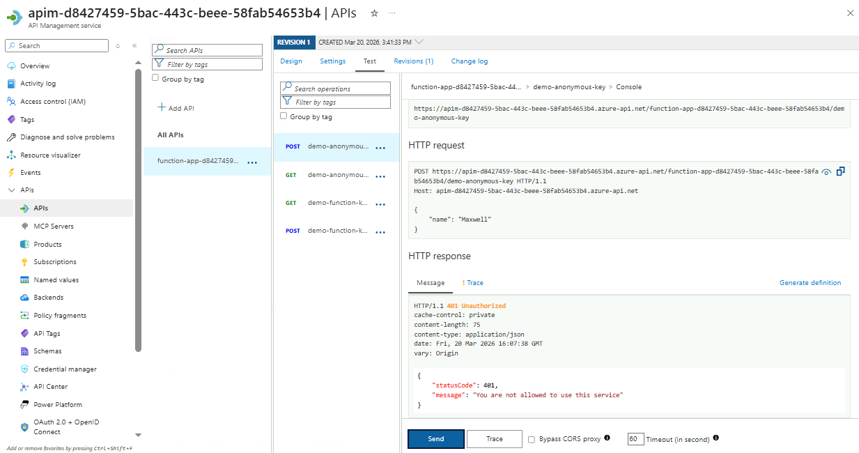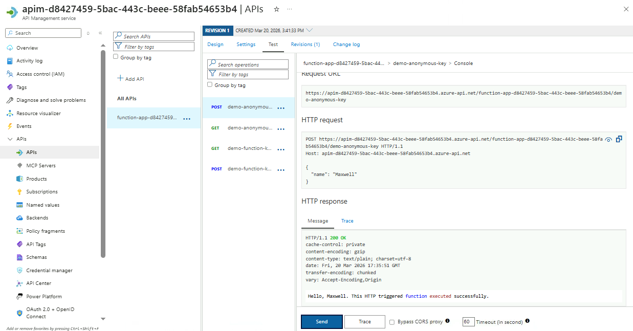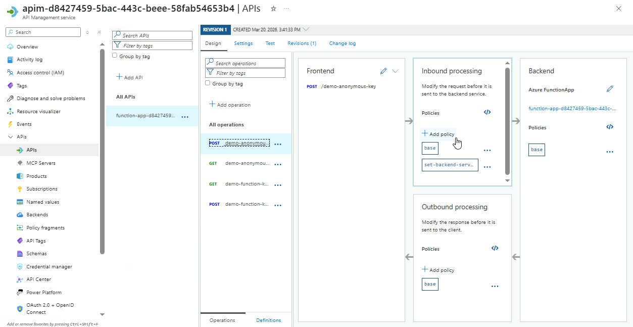 This lab demonstrates how to secure Azure Functions APIs, manage access with API keys, and apply APIM policies to improve reliability and performance.