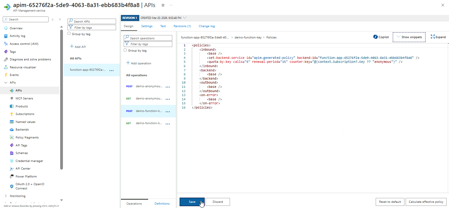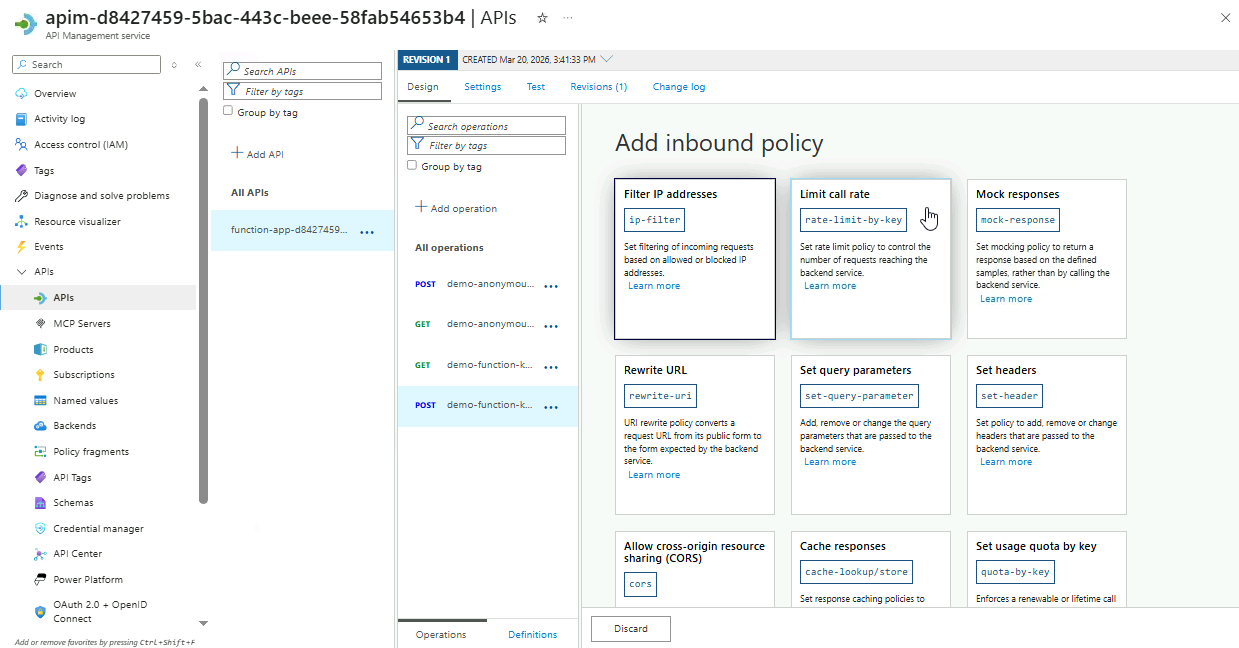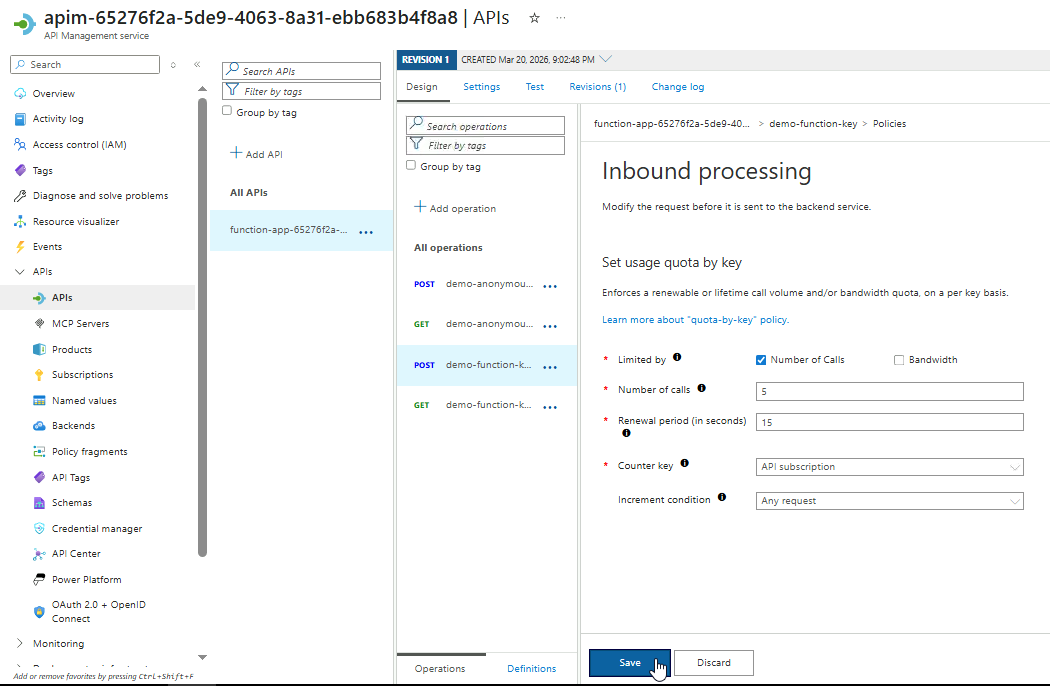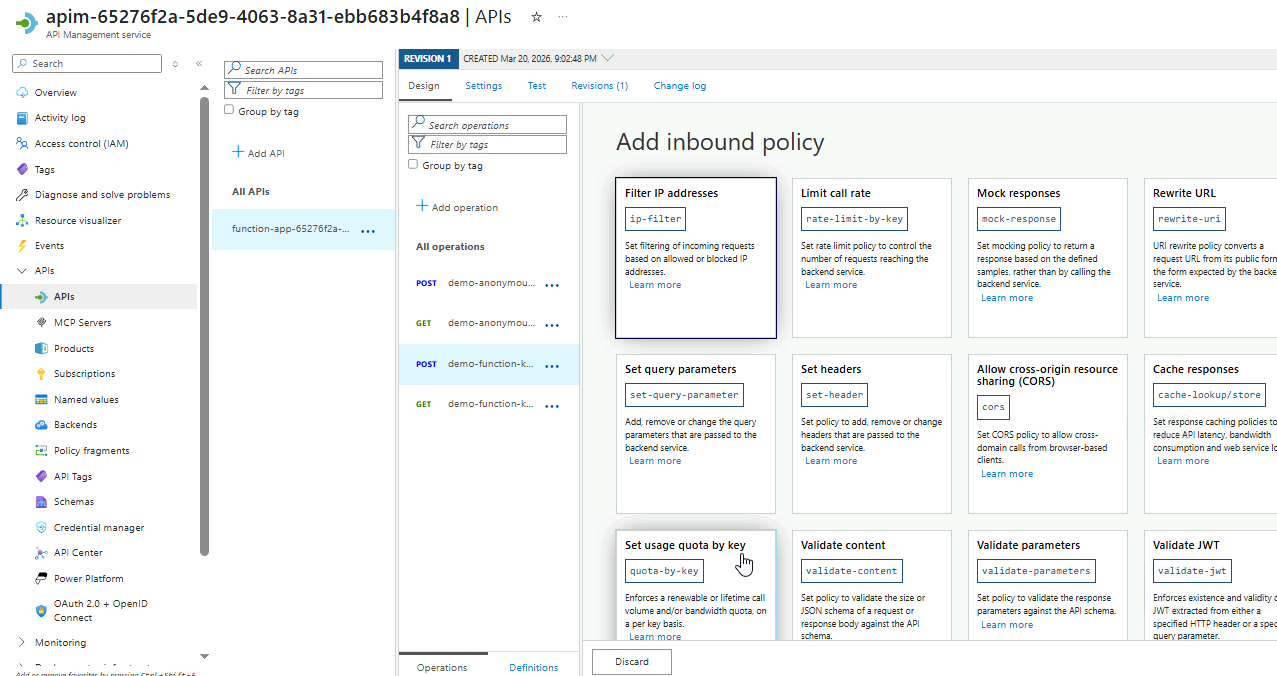 Note: If you're using the Consumption SKU for Function App, you may get an error when adding the ratelimit policy and setting up usage quotas.