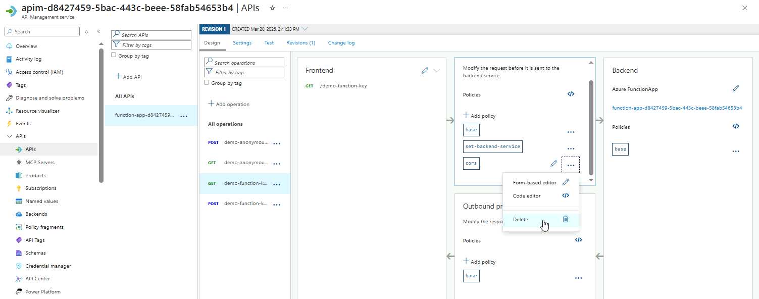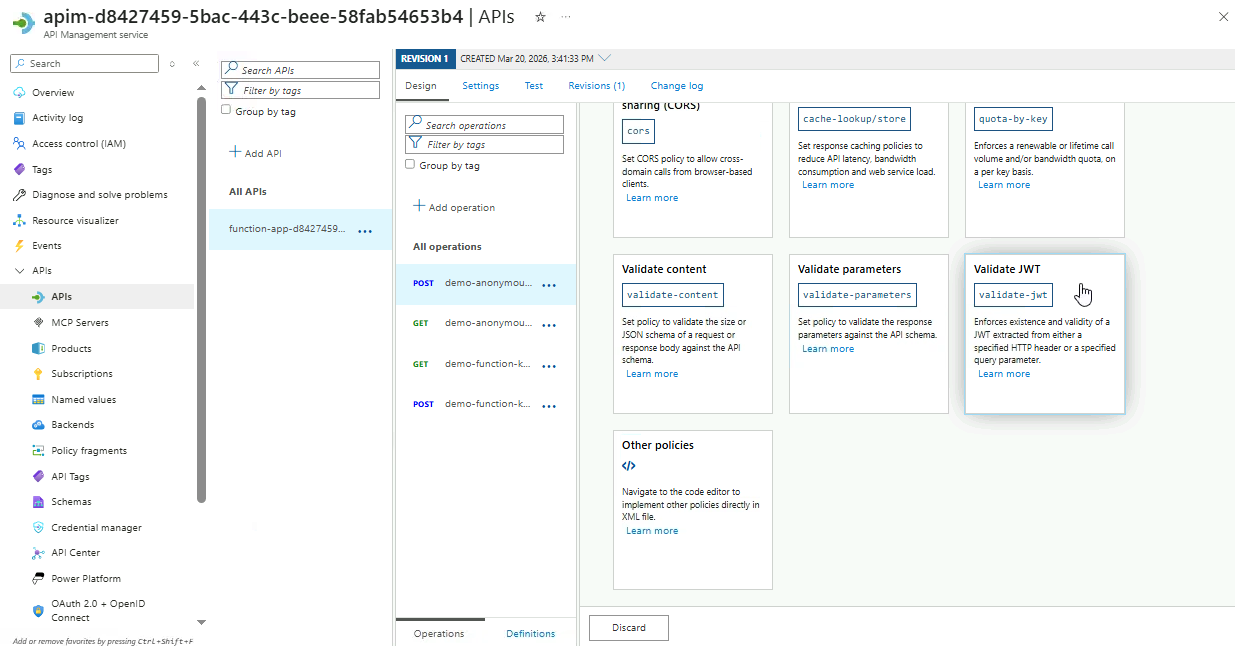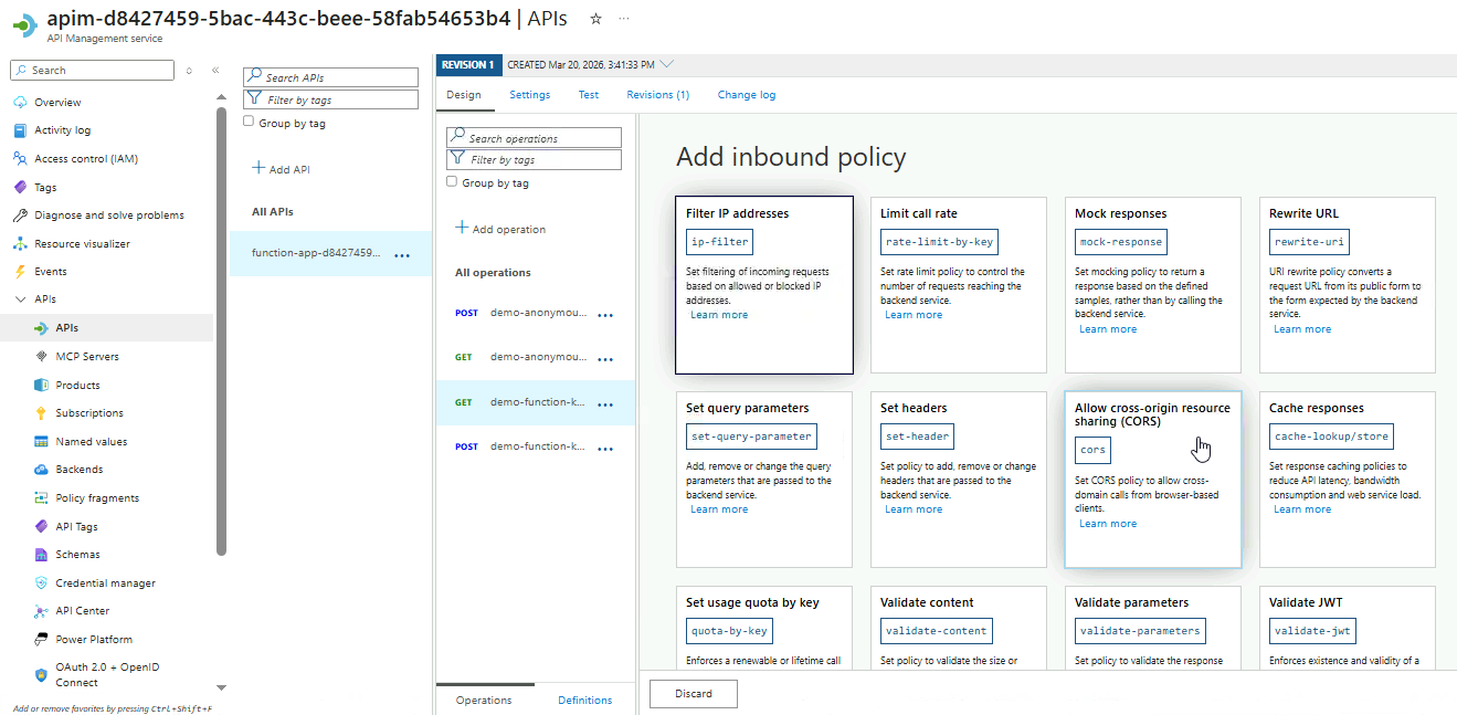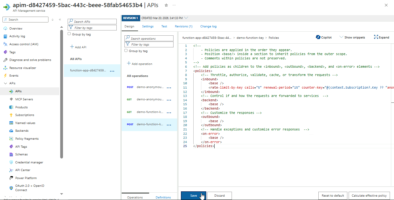 Note: If you're using the Consumption SKU for Function App, you may get an error when adding the ratelimit policy and setting up usage quotas.