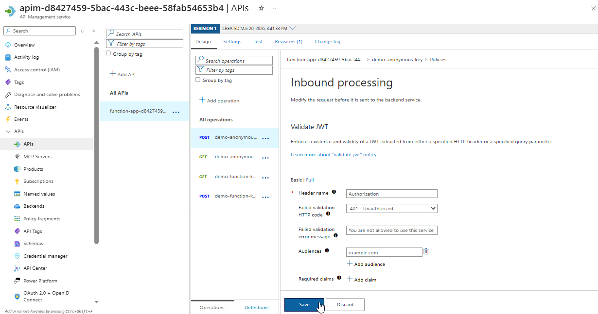 Authorizationheader is used because it is the standard way to send JWT tokens in API requests. This ensures all incoming requests include a valid token.Click Save.