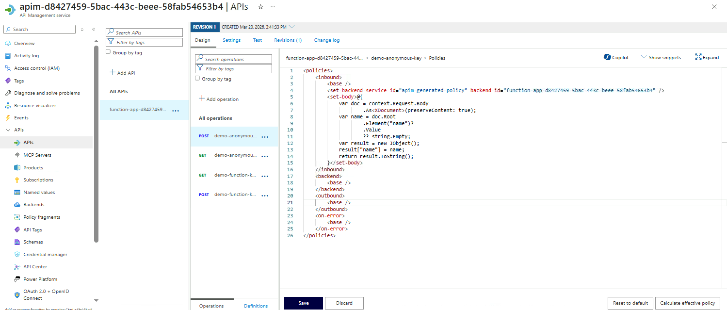 The goal is to apply an inbound policy that converts incoming XML requests into JSON for the backend and transforms the plain-text response into XML before returning it to the client.