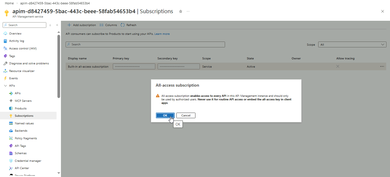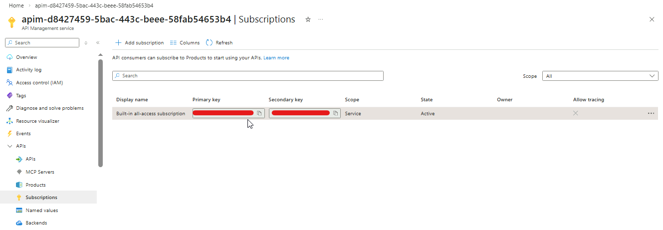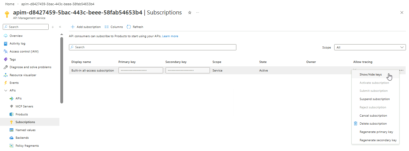 infoThe Built-in all-access subscription is automatically created for every APIM instance. It provides a default key so you can test your APIs without creating a new subscription.