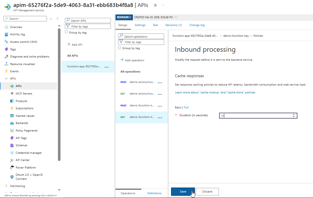 This section shows how to add a response caching policy to an HTTP endpoint in APIM and where to configure it.