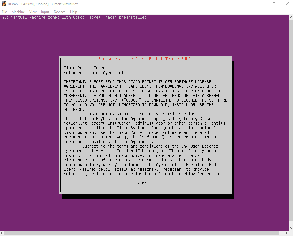 Continue starting the virtual machine and accept the Cisco Packet Tracer license to proceed.