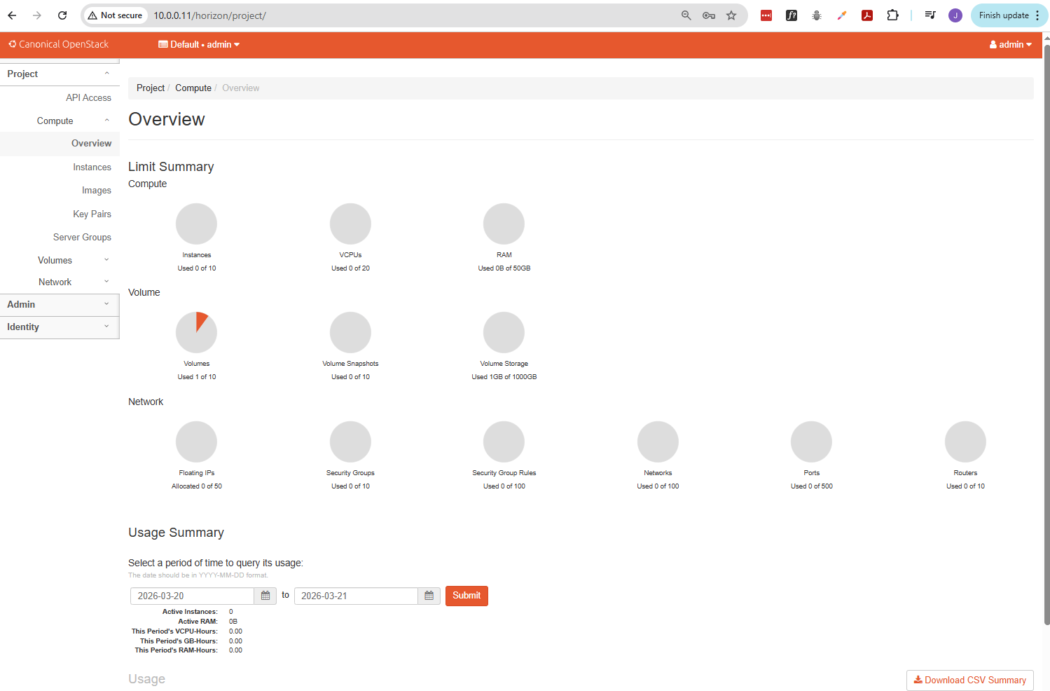 After login, Horizon shows the Compute Overview. This page displays resource usage like instances, vCPUs, and RAM.