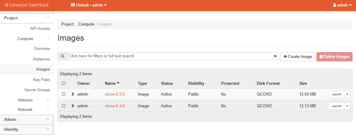 The Images page usually contains a small test image like Cirros.