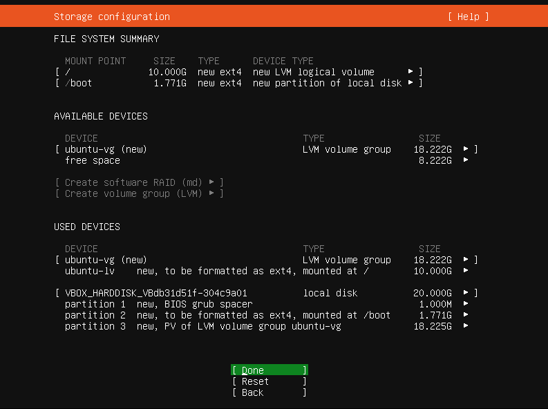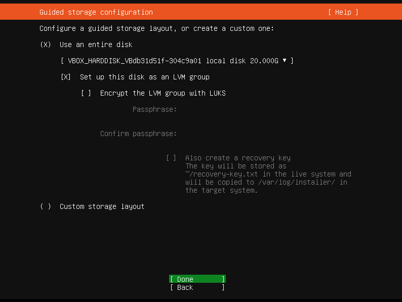 Select Use an entire disk -> Set up this disk as an LVM group and press Enter on Done.
