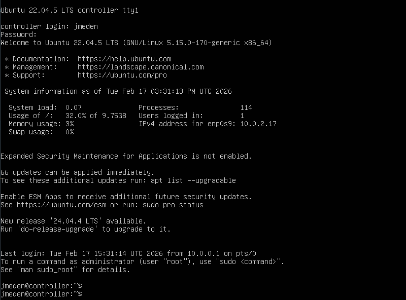 | Controller | enp0s9 (Internet NAT) | 10.0.2.0/24 | DHCP | Auto (DHCP) | Auto (DHCP) |
