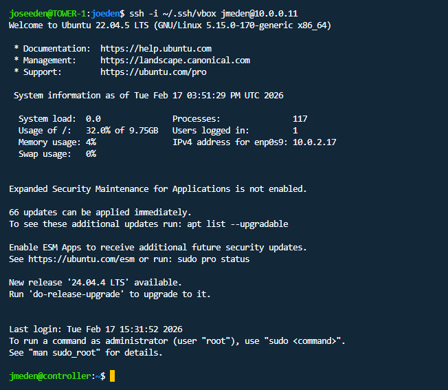 ssh -i ~/.ssh/vbox jmeden@10.0.0.11
