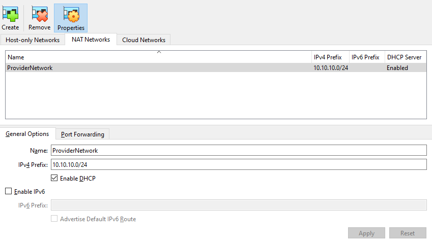 | NAT Network | ProviderNetwork | Provider / VM traffic | 10.10.10.0/24 | Disabled (manual IPs optional) |
