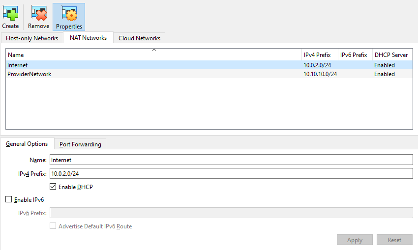 | NAT Network | Internet | Internet access / Updates | 10.0.2.0/24 | Enabled |