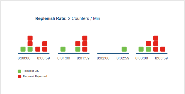 The sliding window counter allows a set number of requests over a rolling time period. This duration of time is not a fixed window and the counter is not replenished when the window begins again.