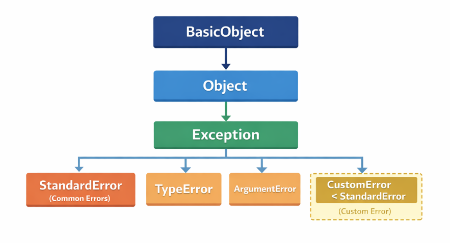 At the top, everything inherits from BasicObject, then Object, then Exception. Under Exception are more specific errors like: