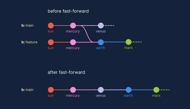 In this case, Git integrates the commits by simply moving the pointer of the target branch to the latest commit of the source branch. No new merge commit is created.